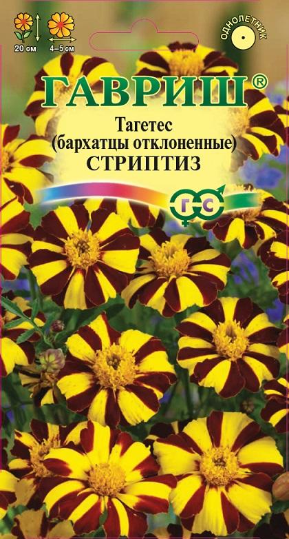 Травянистое растение семейства Сложноцветные. Образует компактный густоветвящийся куст высотой 40 см. Соцветия двуцветные с чередующимися желтыми и коричневыми полосами. В открытый грунт можно высевать в конце мая — начале июня. Всходы появляются на 5-10 день. Почву желательно накрыть нетканым материалом (акрил, лутрасил). В этом случае сеять можно на неделю-полторы раньше обычных сроков и тем самым ускорить цветение. На рассаду сеют в начале апреля. Цветение начнется в июне. Бархатцы, высаженные рядом с огородными культурами уменьшают их поражение грибными заболеваниями, особенно фузариозом, защищают от некоторых видов нематод. Бархатцы используют во всех видах цветников. Они хорошо растут в горшках, вазонах, балконных ящиках, в сочетании с примулами и цинерариями. Осенью цветущие растения можно перенести в комнату, где они прекрасно растут в течение всей зимы, а весной, высаженные в открытый грунт, образуют большой цветущий куст.