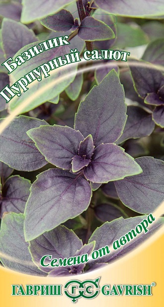 Раннеспелый урожайный сорт базилика с насыщенным гвоздичным ароматом. К массовой уборке зелени приступают через 40-45 дней после появления всходов. Растение очень красивое, высотой 30-40 см, с аккуратной приподнятым розеткой, диаметром 22-25 см. Листья среднего размера, яйцевидные, гладкие, зелено-фиолетового цвета. Базилик придает особый аромат традиционным супам и бульонам, это аппетитная и полезная приправа к мясу, рыбе, свежим салатам и утренним сэндвичам. Благодаря декоративным качествам, кустик Пурпурного салюта, пересаженный в горшок, станет украшением кухонного интерьера. Выращивают рассадным способом или прямым посевом в открытый грунт. Посев на рассаду производят в конце марта – начале апреля. Посев в грунт — в мае или начале июня. Высадка рассады в грунт – начало июня. Схема посадки: 30×30 см. Предпочитает хорошо структурированные, богатые гумусом почвы. Нуждается в регулярных поливах.