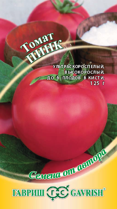 Ультраскороспелый (90-95 дней от всходов до плодоношения) высокорослый (до 150 см) сорт, рекомендован для выращивания в открытом грунте и под временными пленочными укрытиями. Посев на рассаду начало-середина апреля. Пикировка в фазе первого настоящего листа. Высадка рассады в грунт в начале мая в возрасте 30-35 дней. Необходима подвязка растений к кольям через месяц после посадки. Плоды округлой формы, ярко-розовые, без пятна, массой около 120-125 г. В кисти формируется 6 плодов. Благодаря великолепному, гармоничному вкусу незаменим в летних свежих салатах. Прекрасно подходит для консервирования. Схема посадки 30х50 см. Не поражается фитофторой благодаря высокой скороспелости, отдает основной урожай за первый месяц плодоношения. Начало плодоношения – начало июля. Урожайность одного растения 3-4 кг.