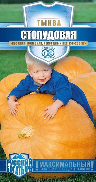 Позднеспелый (от полных всходов до сбора плодов 125-140 дней) сорт гигантской тыквы. Растение мощное. Плод неправильной округлой формы, сегментированный, серо-желтого цвета, средней массой 10-20 кг. При выращивании на плодородной почве и хорошем уходе отдельные плоды этого сорта достигают рекордных размеров 150-200 кг. Кора толстая, кожистая. Мякоть ярко-желтая, плотная, очень вкусная и полезная. Великолепно подойдет для приготовления каш, пирогов, десертов и запекания. Сорт устойчив к основным заболеваниям тыквенных культур. Отлично хранится. Посев на рассаду — в апреле, высадка рассады в грунт — в мае – июне. Посев непосредственно в грунт — в конце мая – июне. Глубина заделки 3-4 см. Схема посадки: 100х150 см.